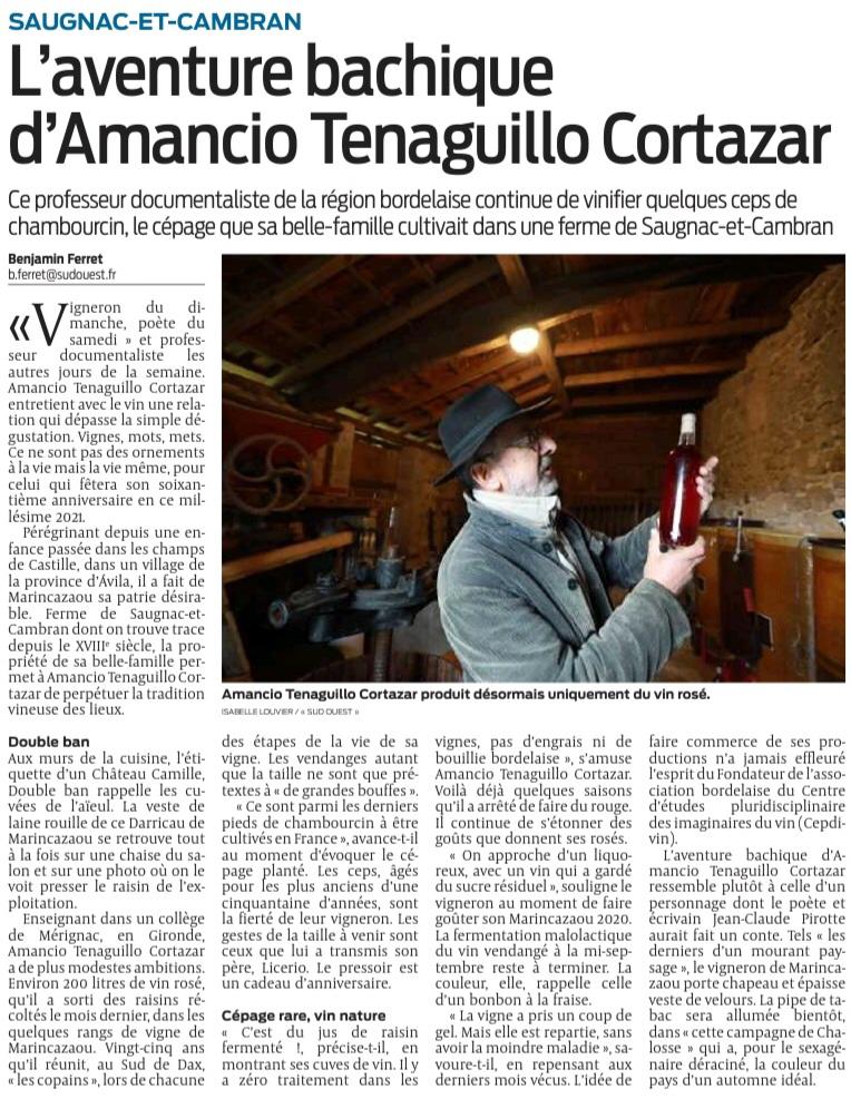 Sud Ouest, 11/11/2021 : « Vigneron du dimanche, poète du samedi » : l’aventure bachique d’Amancio. Par Benjamin Ferret.