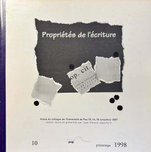 « Pratiques d’écriture, pratiques d’espace : Cité de verre, de Paul Auster ; Les Géants, de J.M.G. Le Clézio », in Actes du Colloque International : « Propriétés de l’écriture » (Univ. Pau, nov. 1997, Centre de Recherches sur les Poétiques et Modèles Critiques), revue Op. cit., n° 10, PUP, juin 1998, 9 pages.