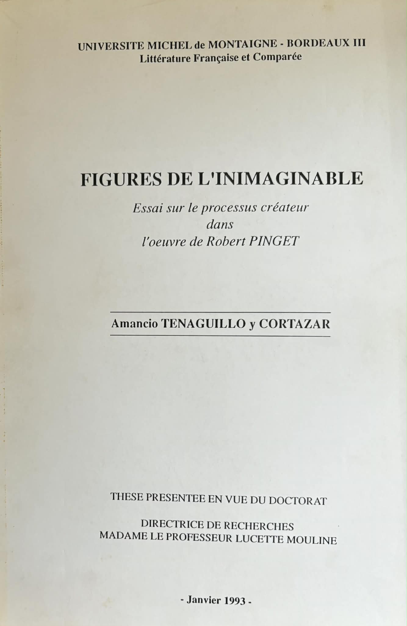 Figures de l’Inimaginable. Essai sur le processus créateur dans l’œuvre de Robert Pinget : THÈSE DE DOCTORAT en Littérature Française et Comparée sous la direction de Madame le professeur Lucette MOULINE. Soutenance le 23 janvier 1993 à l’Université Michel de Montaigne-Bordeaux III. Mention : « Très honorable avec félicitations ». (531 pages)