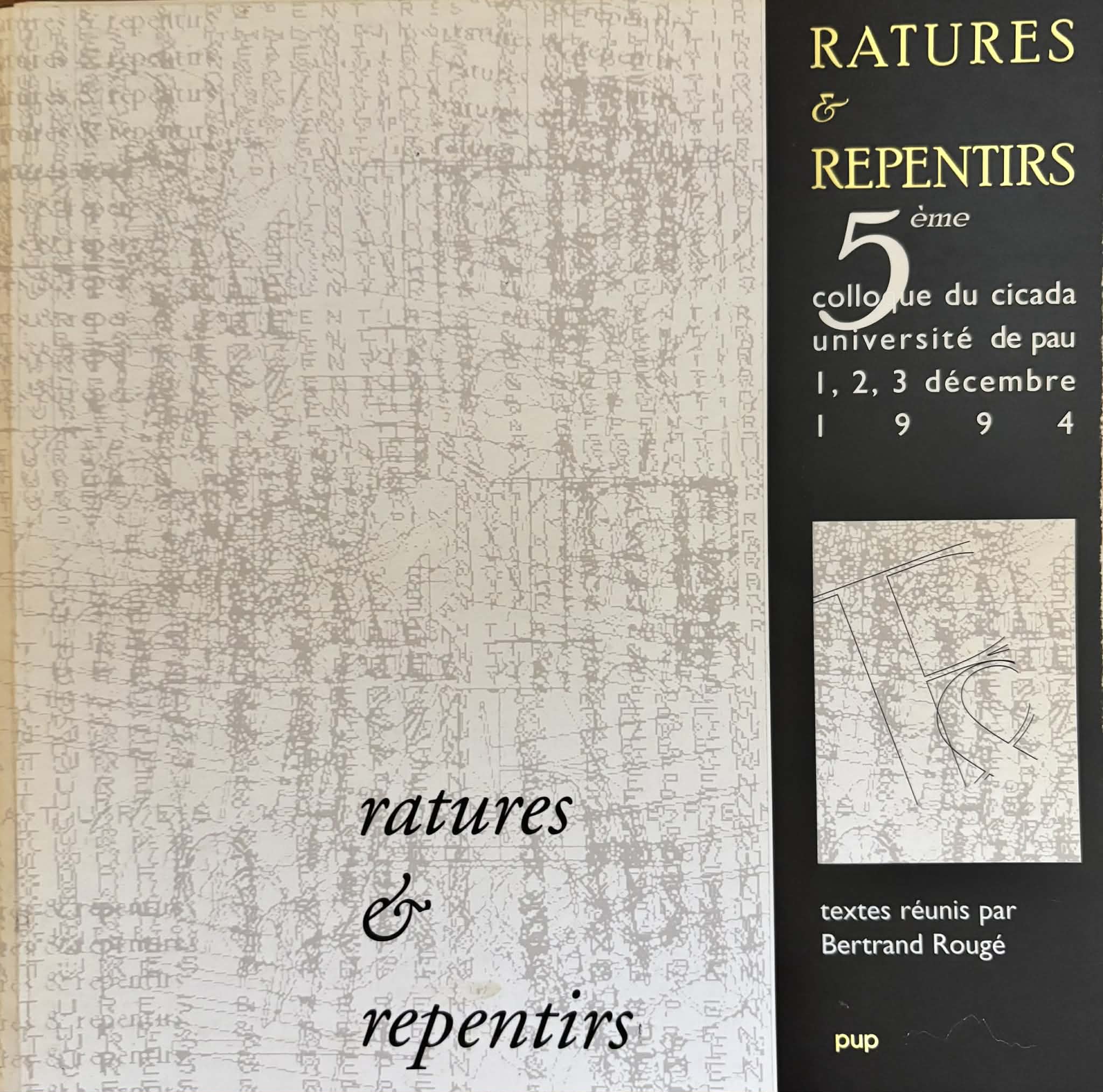 « La scène de la rature : Cervantès, Pinget, Saint Augustin « , in Actes du 5e colloque du CICADA « Ratures et repentirs » (Univ. Pau, décembre 1994), PUP, nov. 1996, 14 pages.