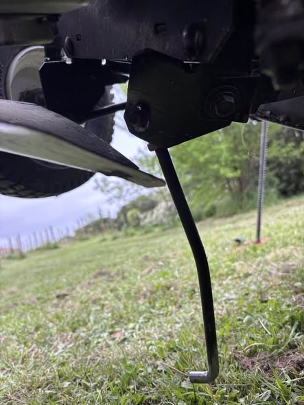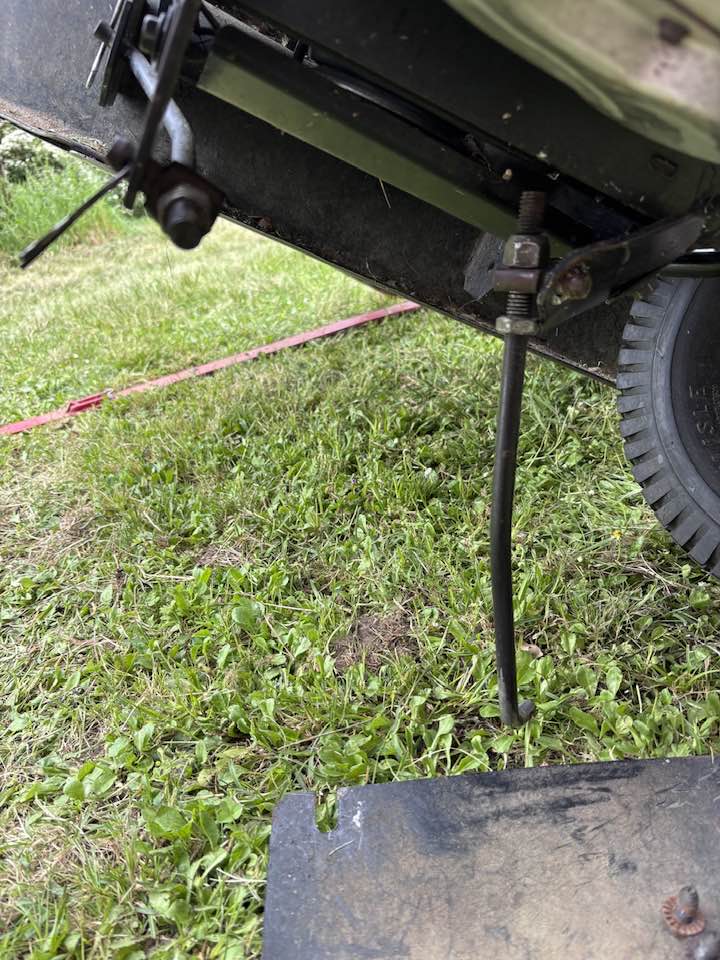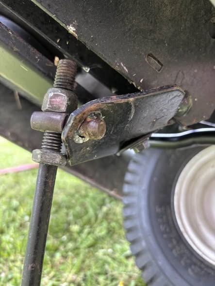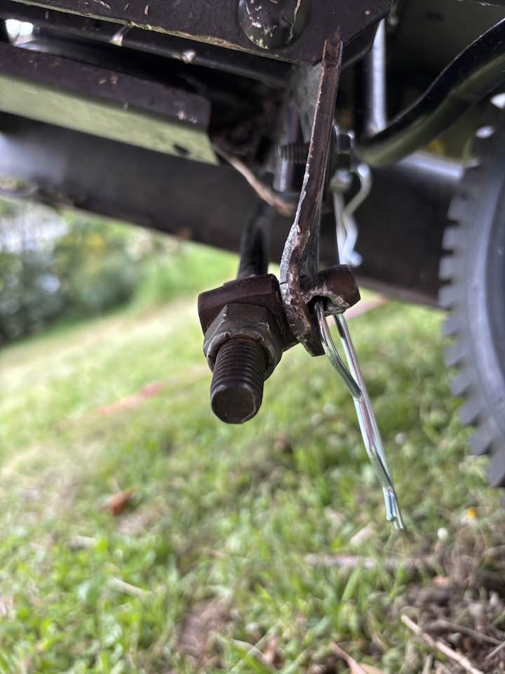 Problème de goupille perdue et de pièce tordue au niveau du chassis de la tondeuse autoportée.