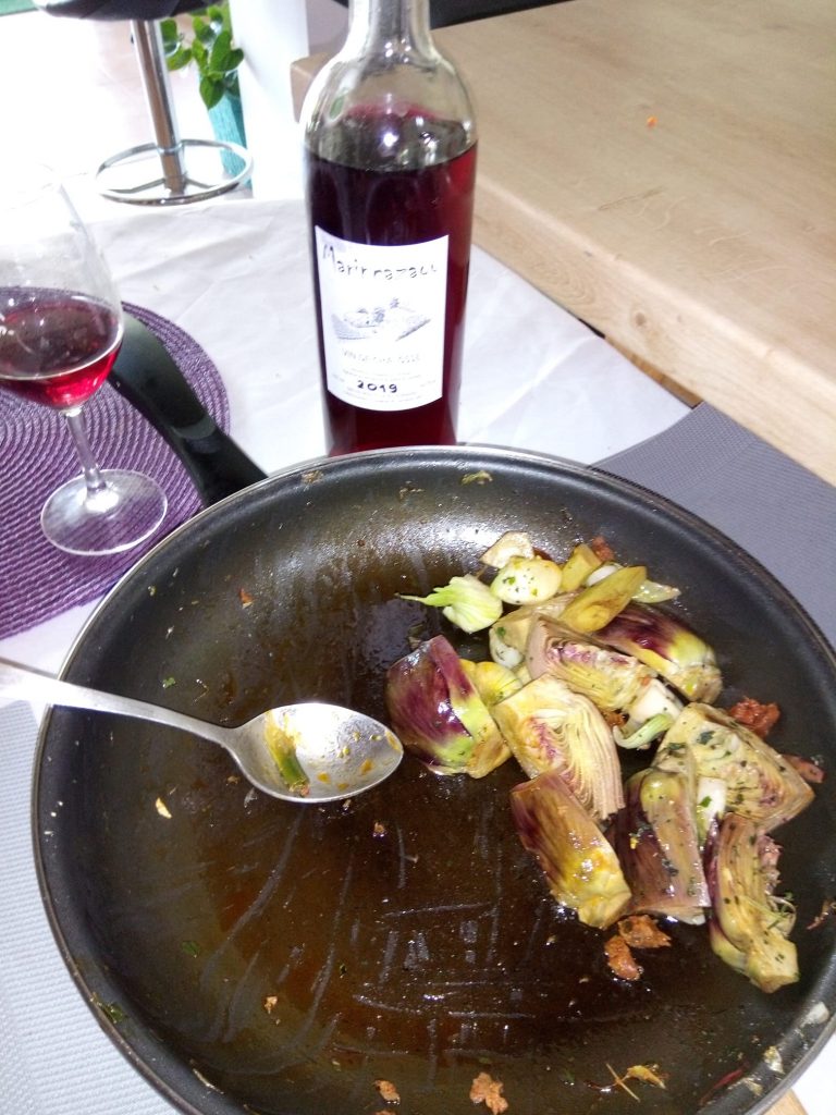 Avec commentaires de Ludovic Pauter : « Alcachofas salteadas con su pizquito de chorizo y cebollita. O sea Pangolino a la jerezana. Y su antidoto. Coteaux de Chalosse hecho naturalmente con uva Chambourcin. »